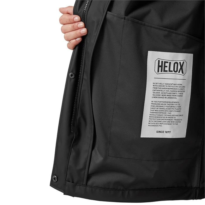 Fabric features a thin sheet of translucent PVC that’s sewn in to make it waterproof. Introduced in 1949, Helox quickly became must-have protection for outdoor use and was used by the Norwegian delegation at the 1952 Olympic Games in Helsinki.